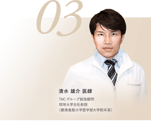 琉球大学 主任教授を勤め、現在は「日本形成外科手術手技学会理事」として美容外科全般の幅広い知見・実績をもつドクターが統括顧問として在籍しております。アカデミックな視点を取り入れた施術を実現します。