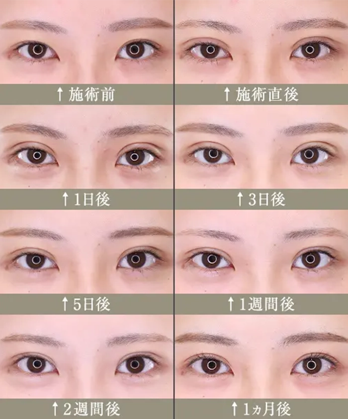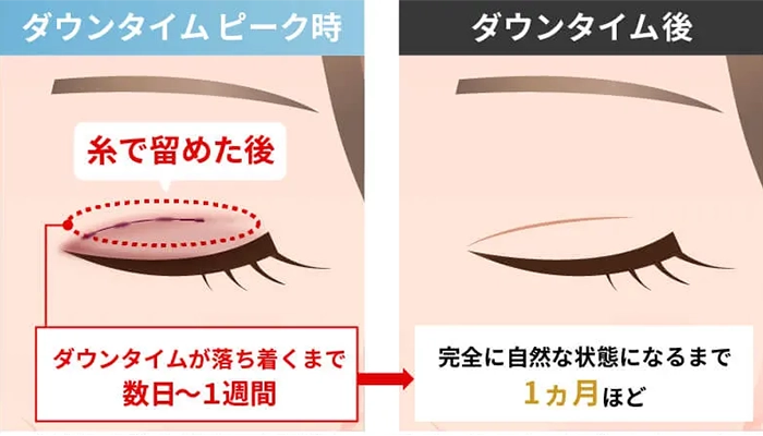 糸を使った二重整形術のダウンタイムの場合、およそ1〜2週間は腫れや内出血などの症状が現れ、まぶたが自然な状態になじむまでには1ヵ月ほどかかる可能性があります。(※個人差があります)