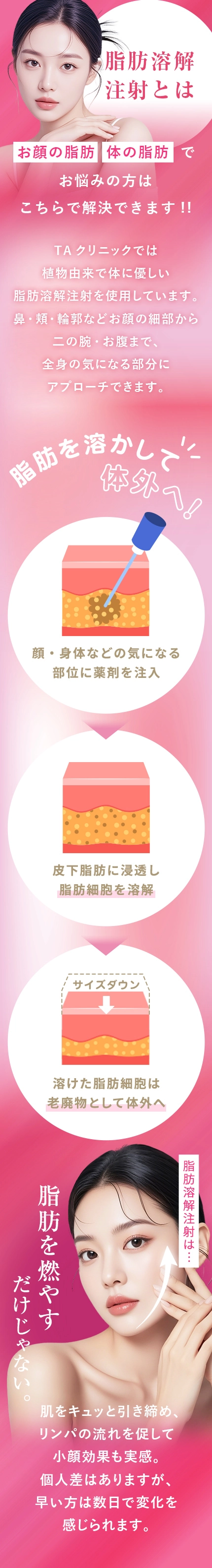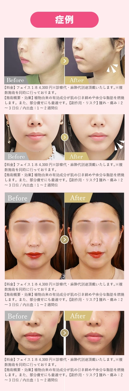 ダイエットでは落ちにくい部分的な脂肪が気になる方、自然に変化していきたい方に選ばれています。周囲に気づかれずに印象を変えたい方にも向いています。