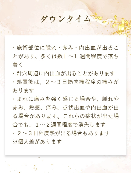 個人差はありますが、多くの方が「予防接種のようなチクっとした感覚」と表現されます。短時間で終わるため、痛みが心配な方でも受けやすい施術です。