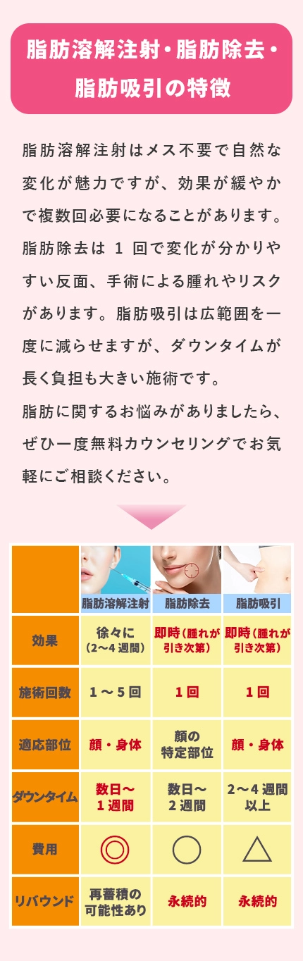 脂肪細胞の数が減るため、一般的にはリバウンドしにくい傾向があります。ただし、食生活や生活習慣によっては再び脂肪がつくこともあるため、日常のケアが大切です。